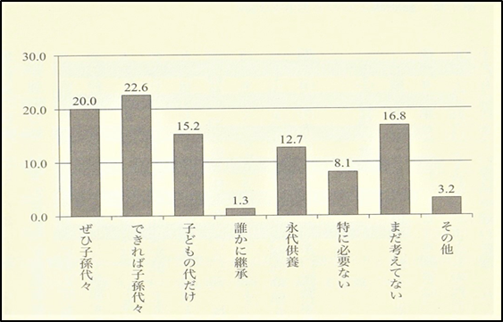 伝統的な家制度が希薄になったとはいえあまり意識は変わっていませんね。また子供の代だけ承継できればという答えも 15%ありました。そこにはお墓の意味と先祖の考え方も反映されています。現代では子孫代々といっても、その範囲は自分が知っている祖父母と孫くらいまでの血縁でしょうか。「先祖観」は大きく変化しています。